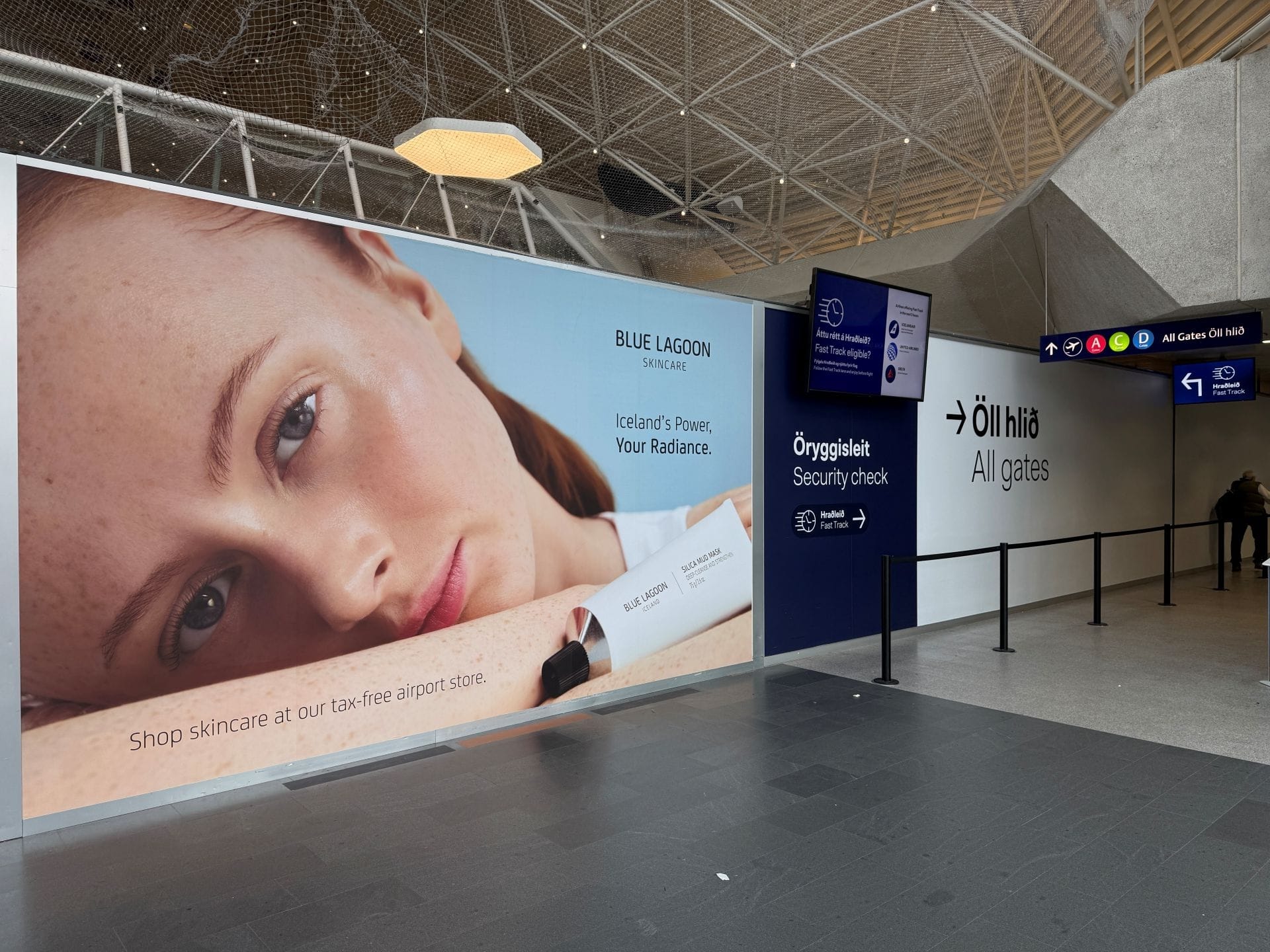 Prentuð mynd á vegg. Stærð á skilti er 508 x 304cm Um er að ræða merkingu á glervegg þegar komið er upp á 2.hæð með lyftu eða stiga, rétt áður en farið er inn í öryggisleit. Frábært tækifæri til að efla vitund farþega um vörumerki eða fyrirtæki sem og rekstraraðila í flugstöðinni. Allir brottfarafarþegar fara fram hjá merkingunni.