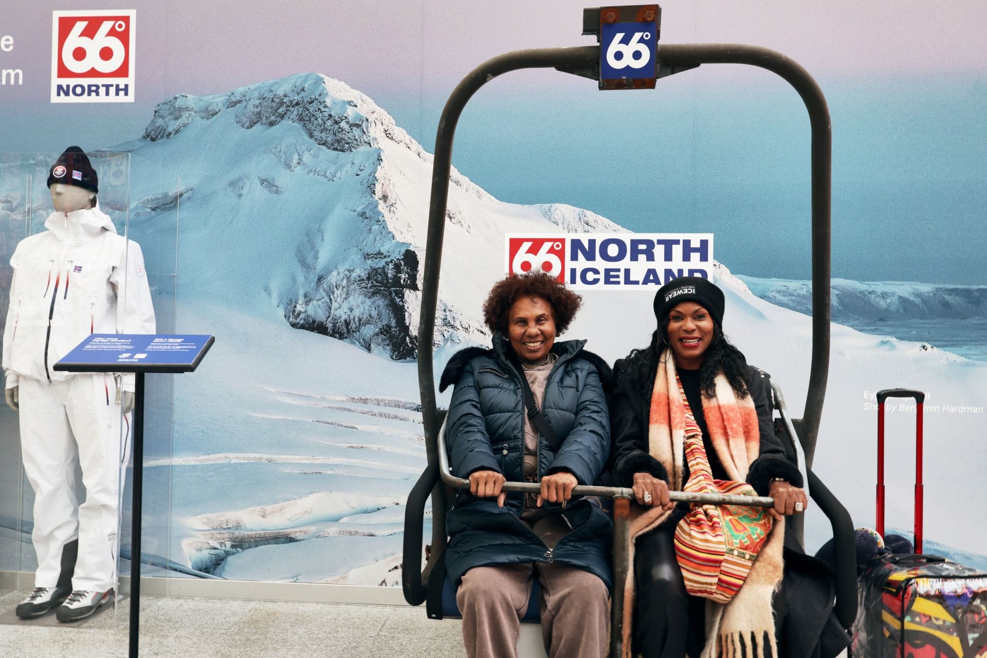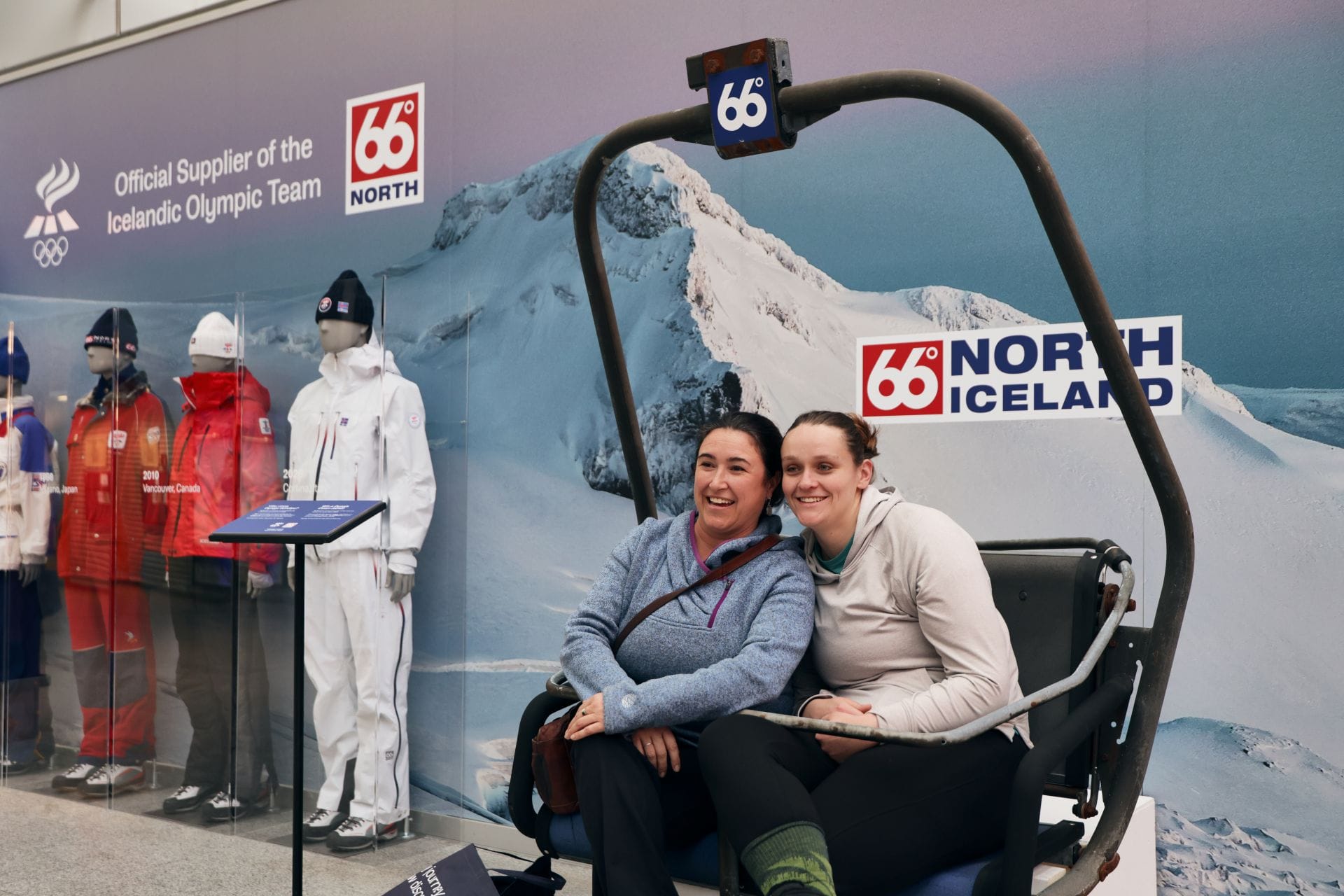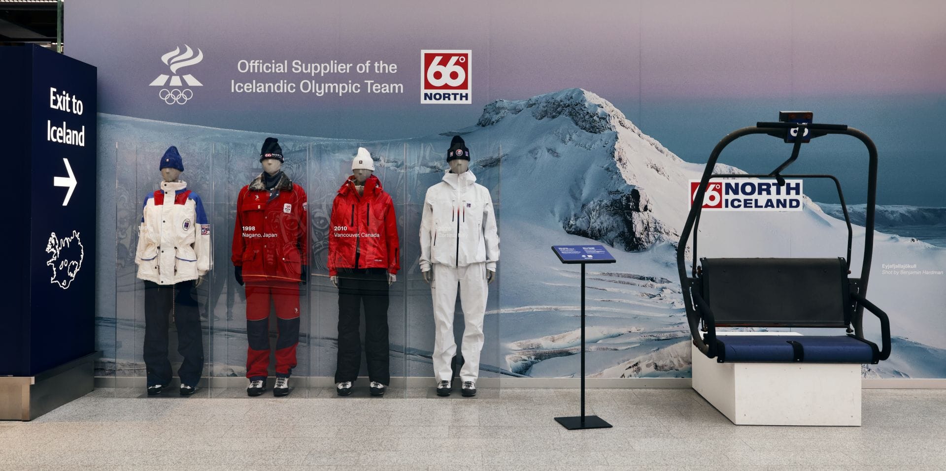 Í ljósi þess að 66°Norður fagnar 100 ára afmæli á árinu þótti skemmtilegt að stilla inngöngufatnaði Ólympíuhópa liðinna ára upp á Keflavíkurflugvelli. Þar má nú sjá inngöngufatnaðinn frá Lillehammer 1994, Nagano í Japan 1998, Vancouver í Kanada 2010 og sérstaka útgáfu af Hornstrandir settinu sem verður inngöngufatnaður landsliðsins í Cortina á Ítalíu 6. febrúar 2026.