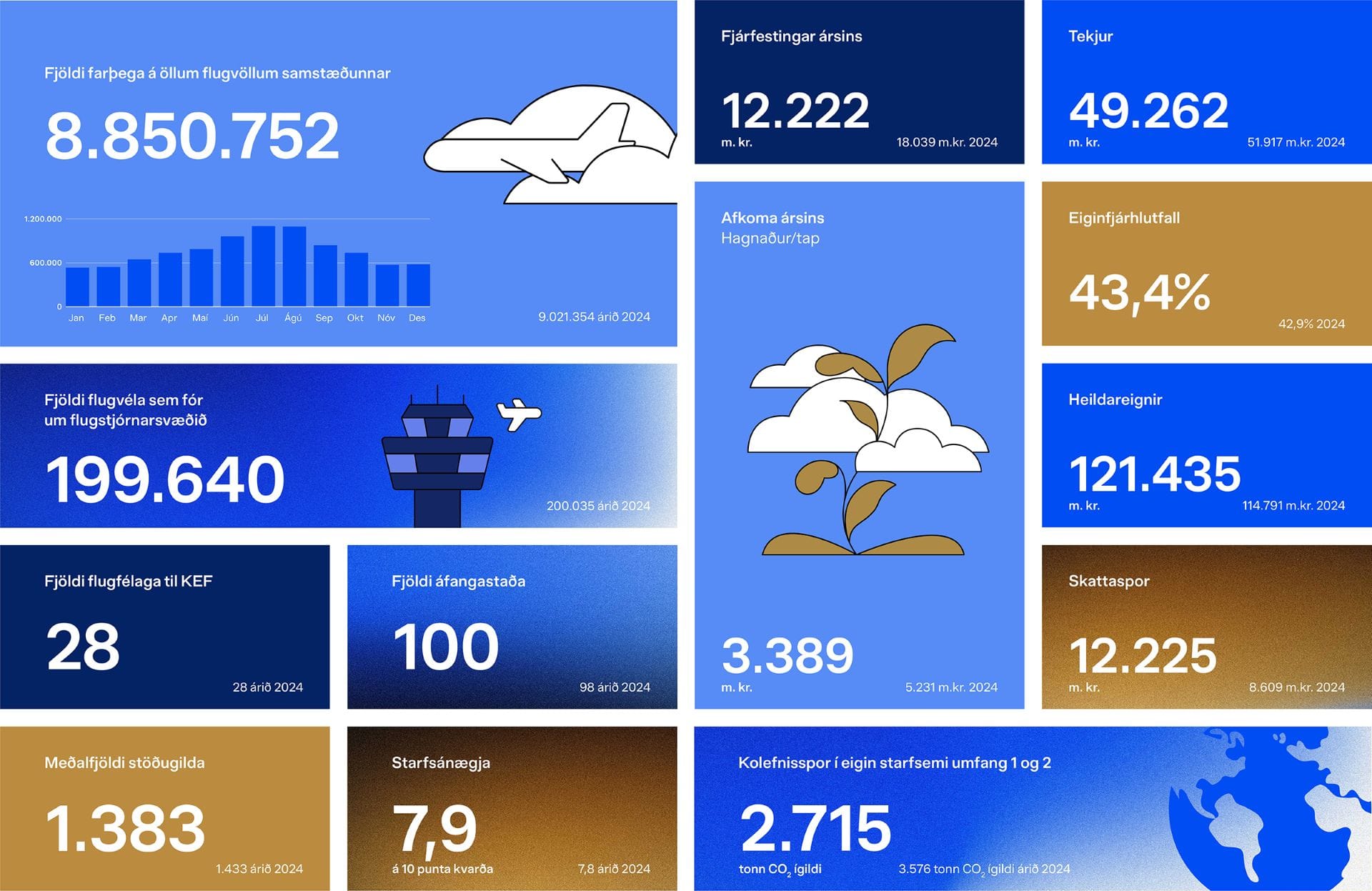 Farþegar Heildarjöldi farþega um alla flugvelli Isavia nam rúmlega 8,8 milljónum árið 2025, sem er 1,9% fækkun frá árinu 2024. Á Keflavíkurflugvelli fækkaði farþegum um 2,0%, á Reykjavíkurflugvelli fækkaði þeim um 5,4% en þeim fjölgaði á Akureyrarflugvelli um 7,6% og á Egilsstaðaflugvelli um 0,8%. Heildarfjöldi millilandafarþega um íslenska áætlunarflugvelli árið 2025 fækkaði úr rúmlega 8,3 milljónum í rúmlega 8,2 milljónir, eða um 1,9% milli ára. Fjölgun á Akureyrarflugvelli var um 33,6%. Innanlandsfarþegum fækkaði á sama tíma úr tæplega 653 þúsund í rúmlega 637 þúsund, eða um 2,3%.