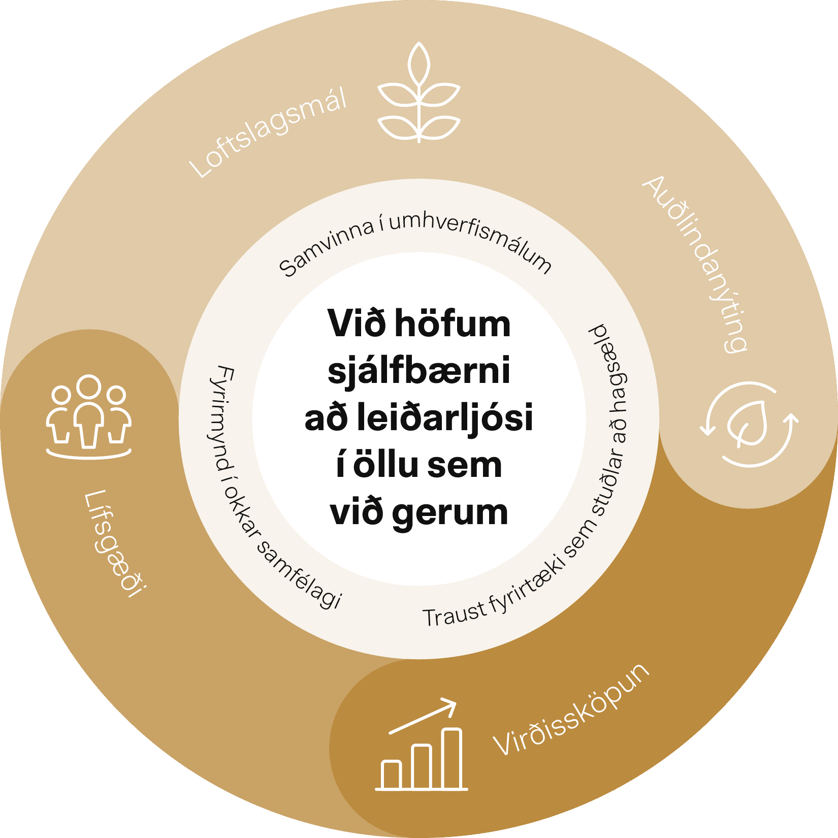 Sjálfbærnistefnan lýsir jafnvæginu á milli efnahags, umhverfis og samfélags. Hún skiptist upp í fjóra þætti sem skipta mestu máli fyrir okkur að leggja áherslu á miðað við heildarstefnuna og þá starfsemi sem félagið er í. Umhverfisþættinum hefur verið skipt upp og loftslagsmál verið sérstaklega dregin þar fram til þess að vekja athygli á mikilvægi þess að minnka kolefnisspor félagsins.