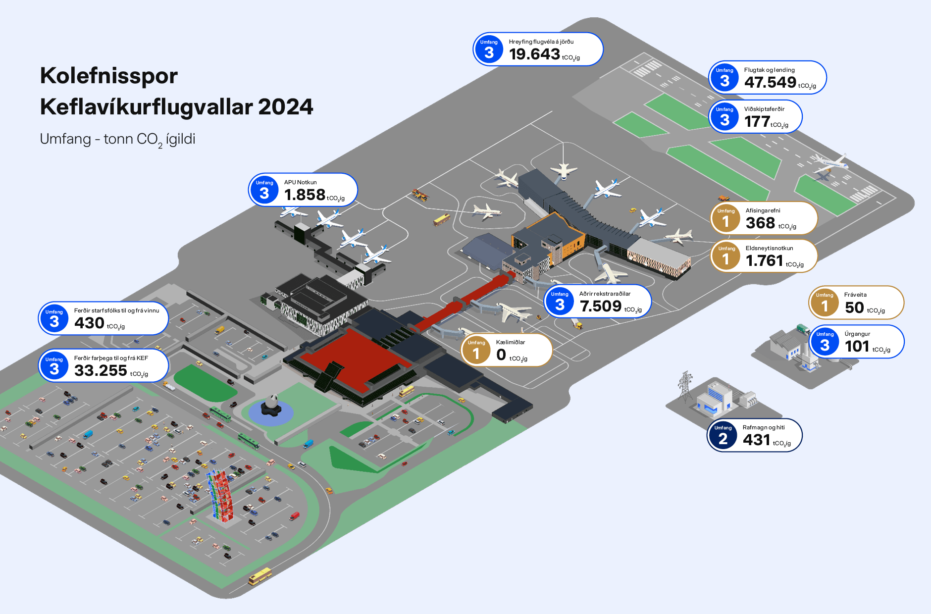 Keflavíkurflugvöllur hefur kolefnisjafnað alla beina losun í starfseminni frá árinu 2018. Frá árinu 2021 höfum við einnig kolefnisjafnað aðra rekstrarþætti sem falla utan umfangs 1, líkt og rafmagn og hita, viðskiptaferðir starfsfólks og aðgerðir vegna förgunar sorps. Árið 2024 var umfang 1 2.178 tonn CO2 ígildi, umfang 2 431 tonn CO2 ígildi og umfang 3 114.267 tonn CO2 ígildi sem gerir heildar kolefnisspor samstæðunnar samstæðunnar 116.877 tonn CO2 ígildi.