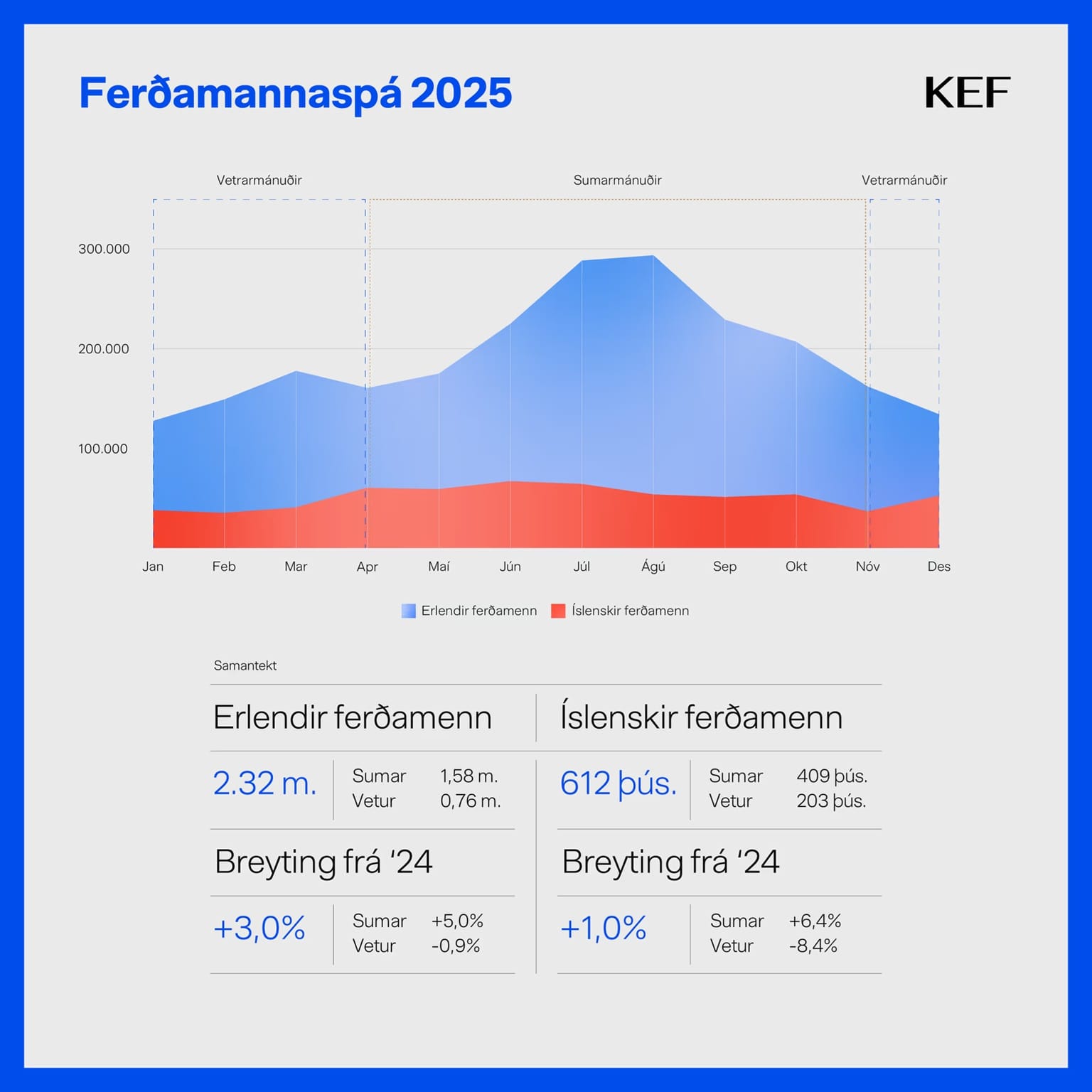 Samkvæmt spánni munu ríflega 2,32 milljónir erlendra ferðamanna koma til Íslands í gegnum KEF árið 2025. Það er tæplega 9 þúsund farþegum meira en metárið 2018 og því stefnir í nýtt metár í komum erlendra ferðamanna til landsins. Á nýliðnu ári voru þeir um 2,26 milljónir og því gert ráð fyrir 3,0% aukningu á milli ára. Mest verður fjölgunin í apríl (16,6%), maí (10,8%) og í júní (6,1%).