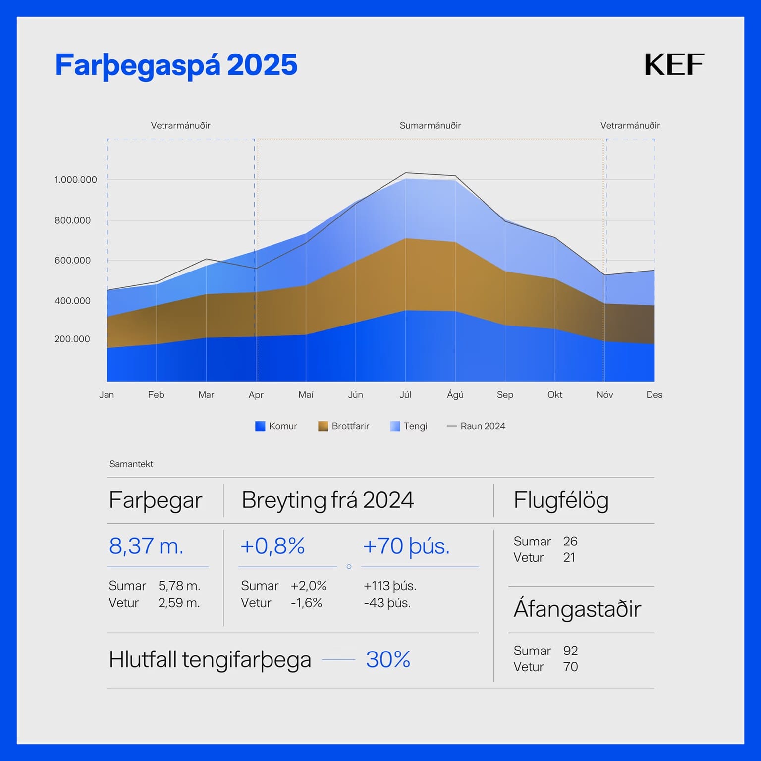 Farþegaspá KEF fyrir 2025 gerir ráð fyrir að 8,37 milljónir farþega fari um Keflavíkurflugvöll. Aðeins tvisvar hafa farþegarnir verið fleiri, 8,76 milljónir 2017 og 9,80 milljónir 2018. Árið 2024 voru farþegarnir tæplega 8,30 milljónir og því gert ráð fyrir 0,8% fjölgun á milli ára. Ef litið er til einstaka mánaða þá verður mest fjölgun farþega á milli ára í apríl, 16,7%, og í maí, 7,1%.