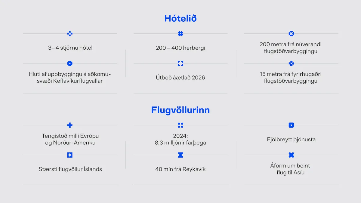 - Markmiðið er að reisa 3-4 stjörnu hótel á aðkomusvæði flugvallarins sem tryggir farþegum góða þjónustu. Sá möguleiki að hafa tvö aðskilin hótel, annars vegar þriggja stjörnu og hins vegar fjögurra stjörnu, verður einnig skoðaður.