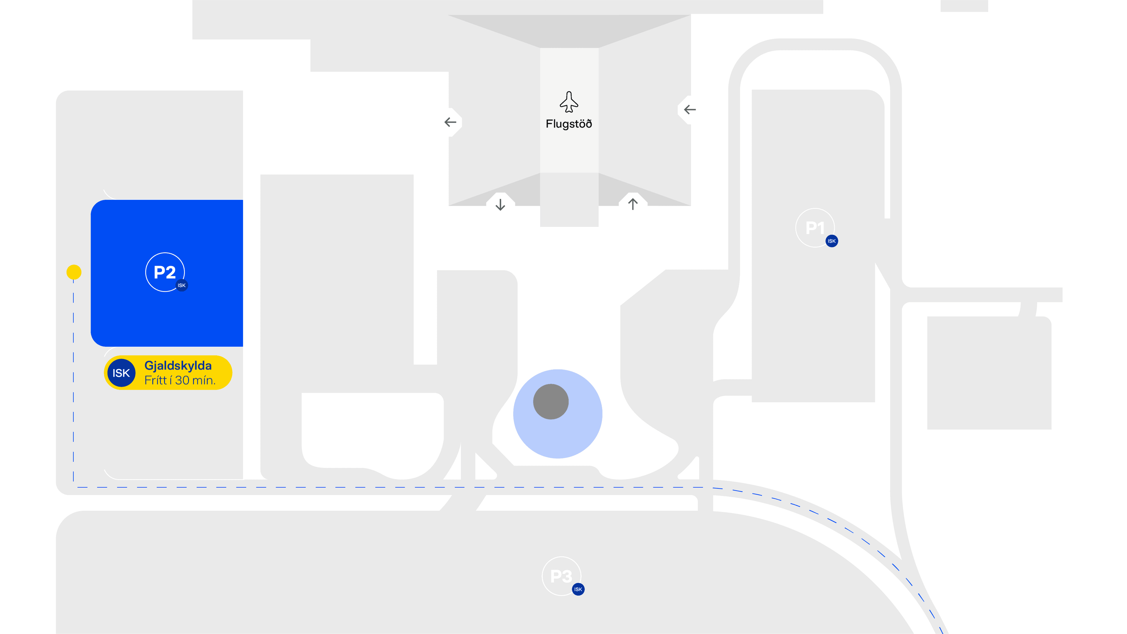 Ef þú ert að sækja á flugvöllinn er hentugast að nota P2 stæðin okkar. Þau eru staðsett nálægt komusal og því fljótlegt að komast út í bíl með farangurinn.