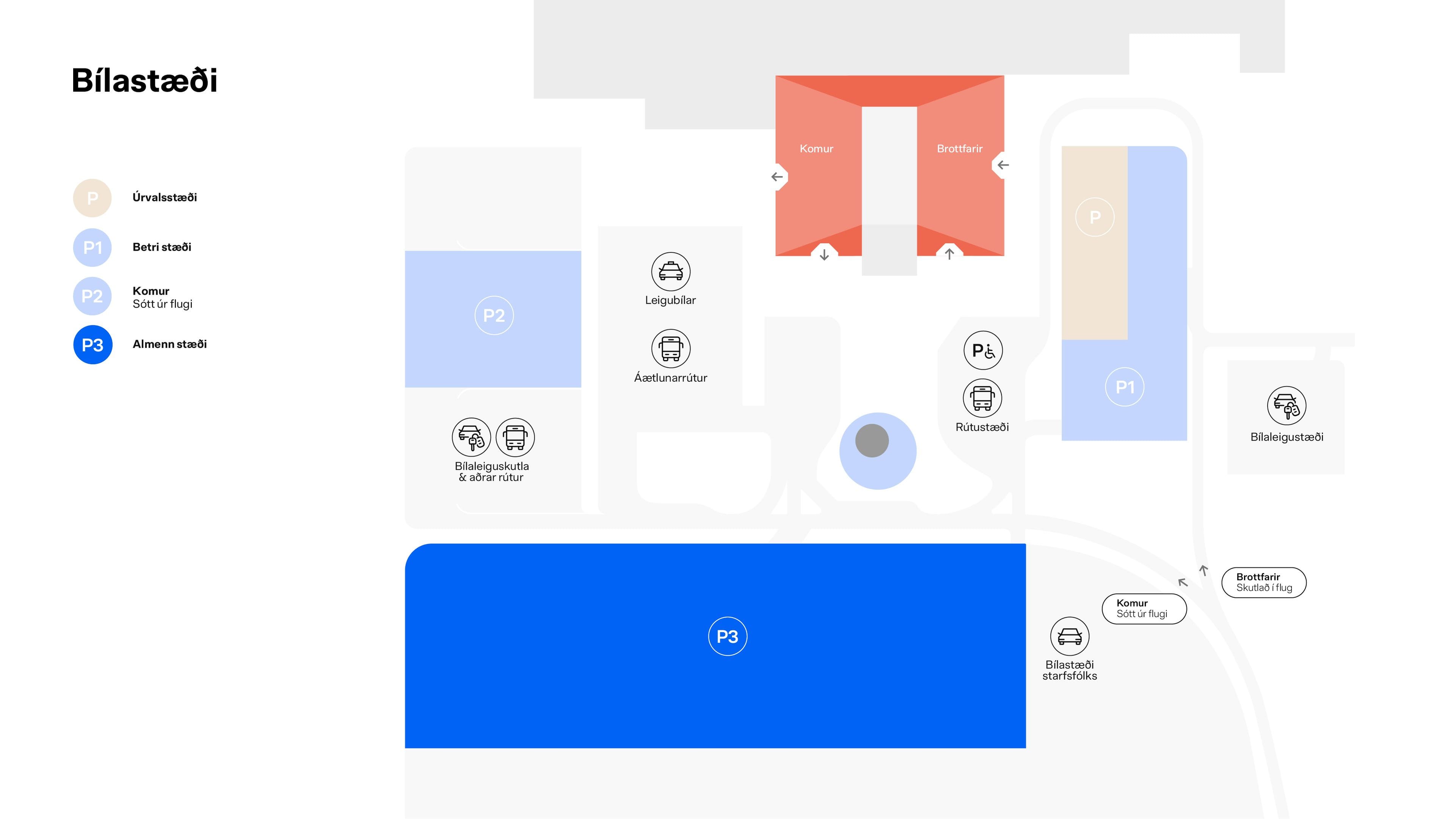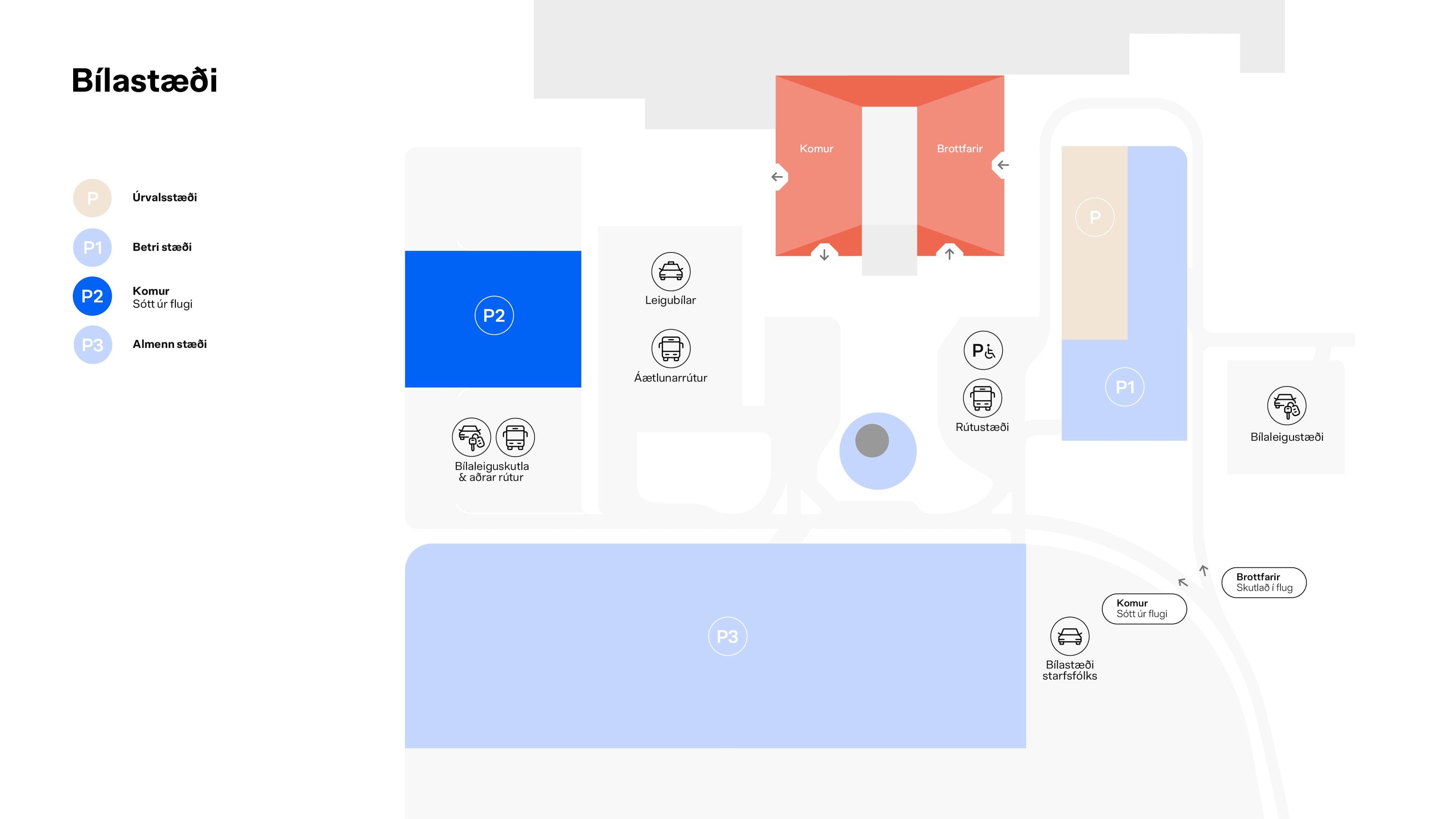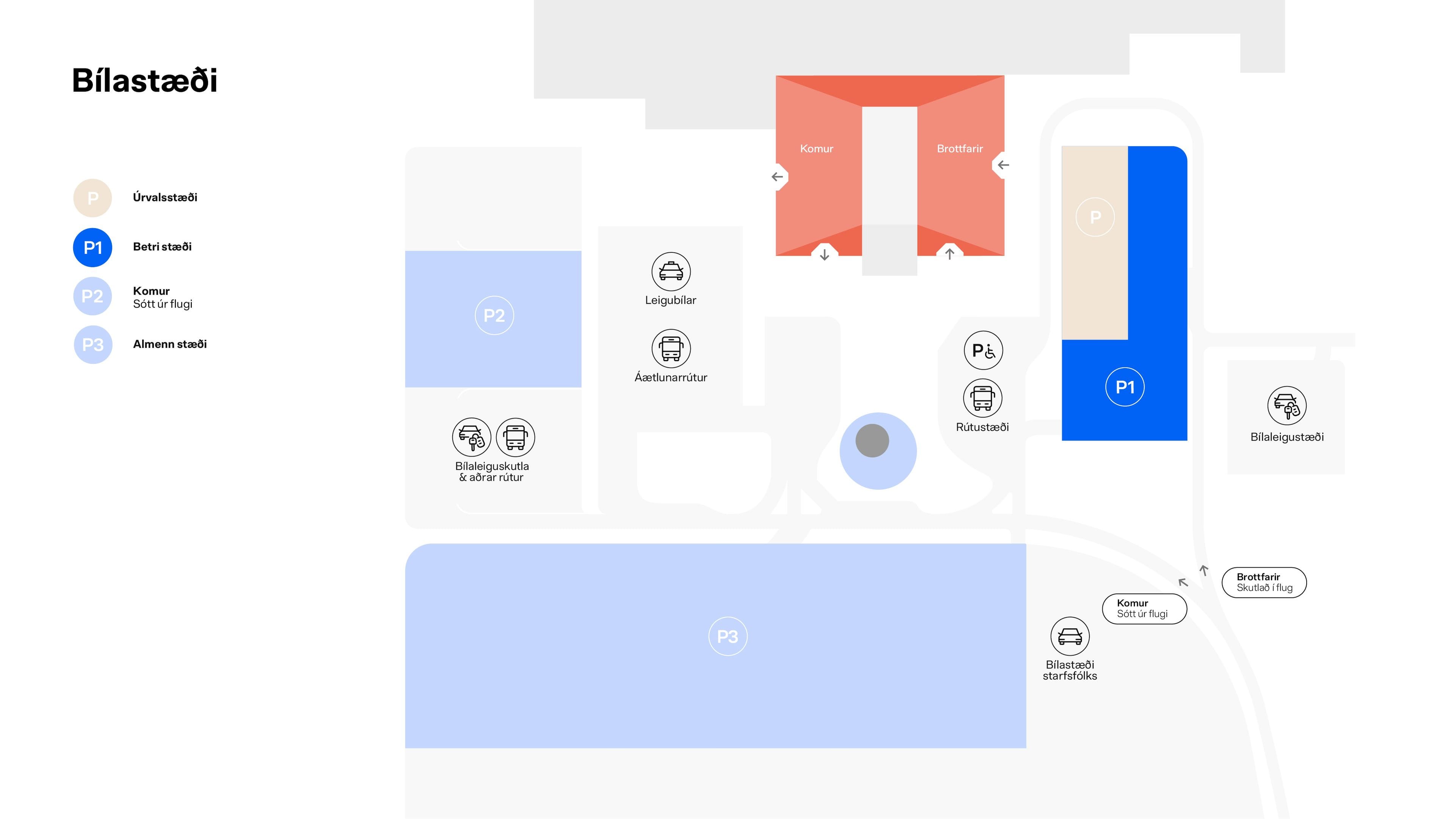 Hér fyrir neðan finnur þú kort af bílastæðum við Keflavíkurflugvöll. P1, P2 og P3. Verðskrá bílastæða finnur þú hér.
